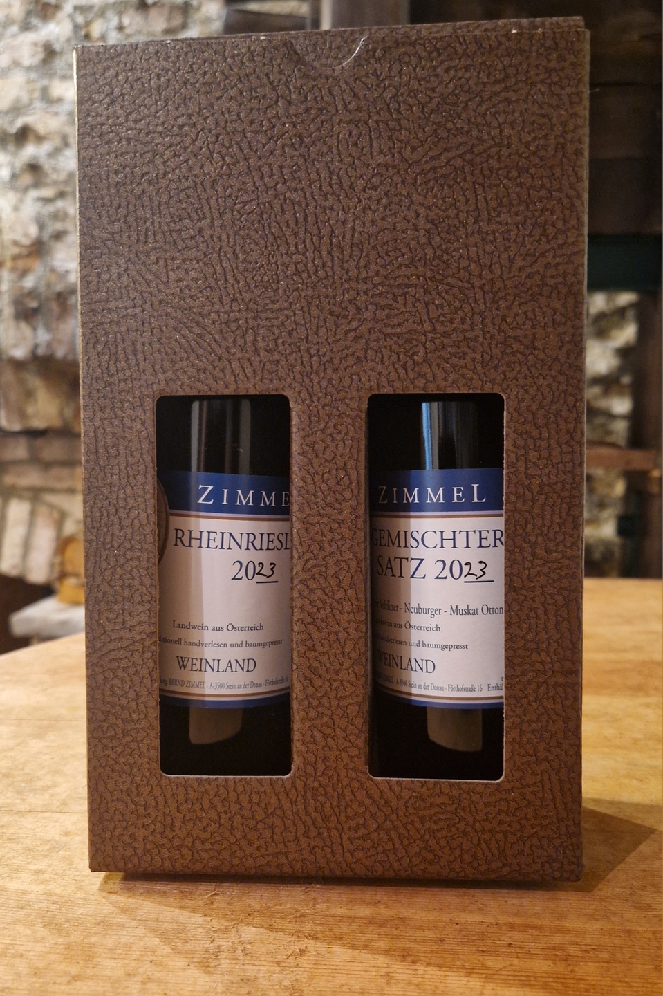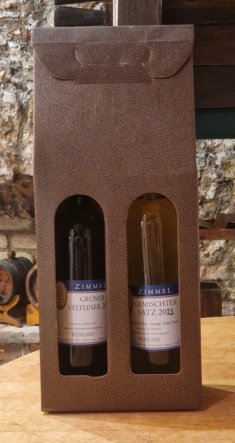2 x 0,75 Liter Flaschen unserer Weine oder Traubensaft im Geschenkskarton in Lederoptik