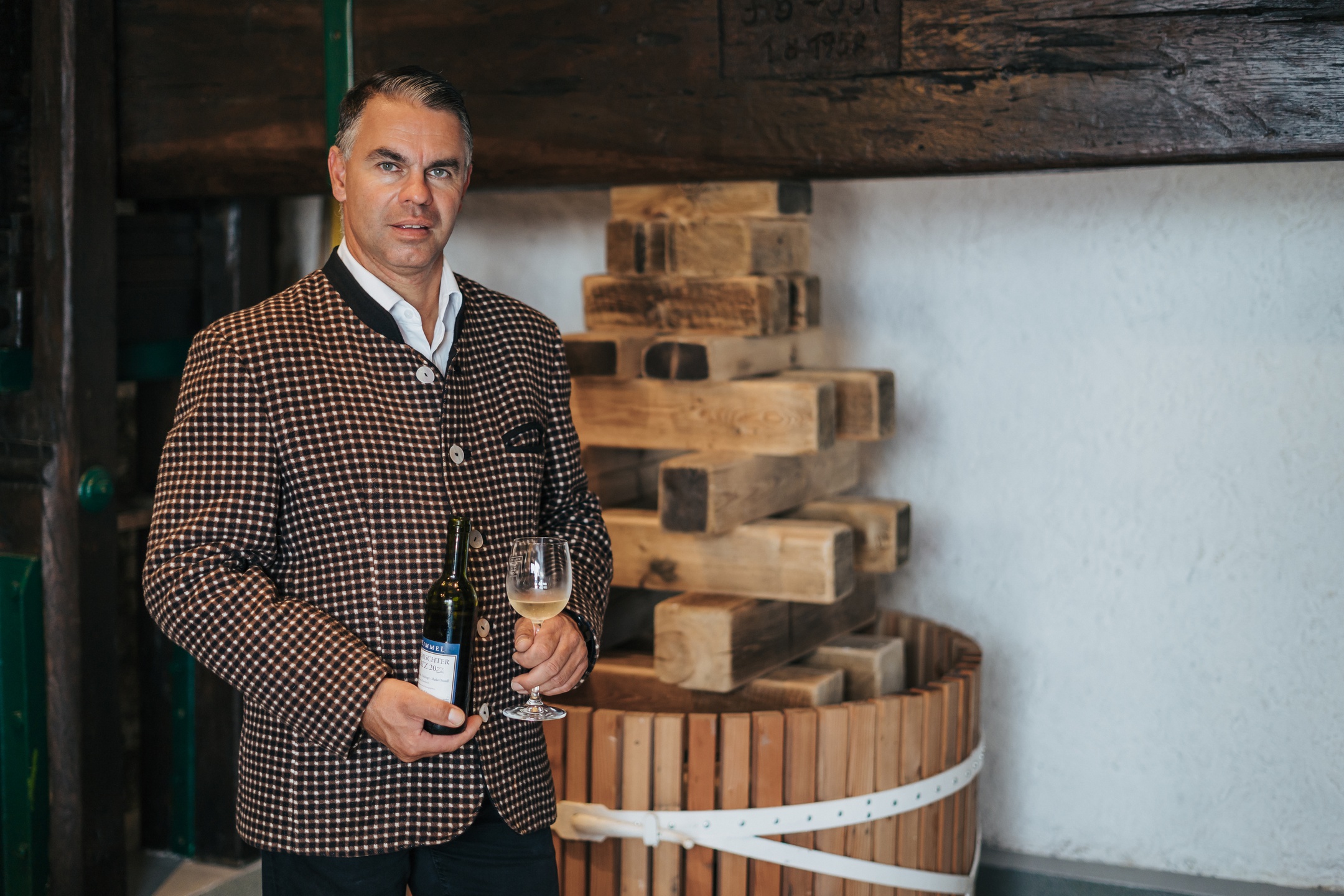 Die Trauben werden von Hand gelesen und schonend in der Holzpresse gepresst, von hier gelangt der Traubensaft direkt in sein Fass.